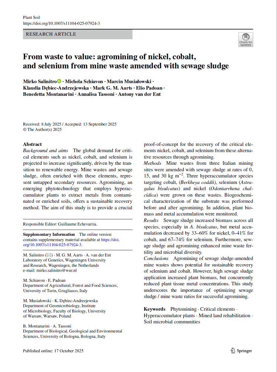 A new paper titled “From waste to value: agromining of nickel, cobalt, and selenium from mine waste amended with sewage sludge” has been published in Plant and Soil. The study, co-authored by MSc Marcin Musiałowski and Dr Klaudia Dębiec-Andrzejewska, was carried out in collaboration with researchers from the University of Bologna, University of Turin, and Wageningen University & Research. The publication presents a sustainable strategy for recovering critical elements from mine waste using agromining combined with organic amendments, contributing to the development of environmentally friendly resource recovery technologies.