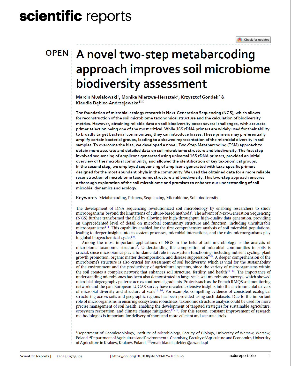 A new article titled “A novel two-step metabarcoding approach improves soil microbiome biodiversity assessment” has been published in Scientific Reports as part of the LIDER program (NCBR) led by Dr Klaudia Dębiec-Andrzejewska. The study was authored by Marcin Musiałowski, Monika Mierzwa-Hersztek, Krzysztof Gondek, and Klaudia Dębiec-Andrzejewska, in collaboration between the University of Warsaw and the University of Agriculture in Krakow.